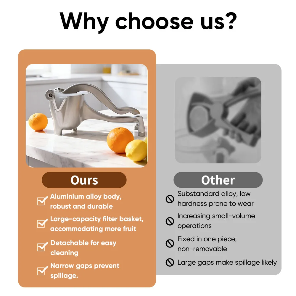 Powerful Lever Action: The precision-engineered mechanical lever amplifies hand pressure, making this manual juicer 50% more efficient at extracting juice from tough citrus fruits compared to handheld models.