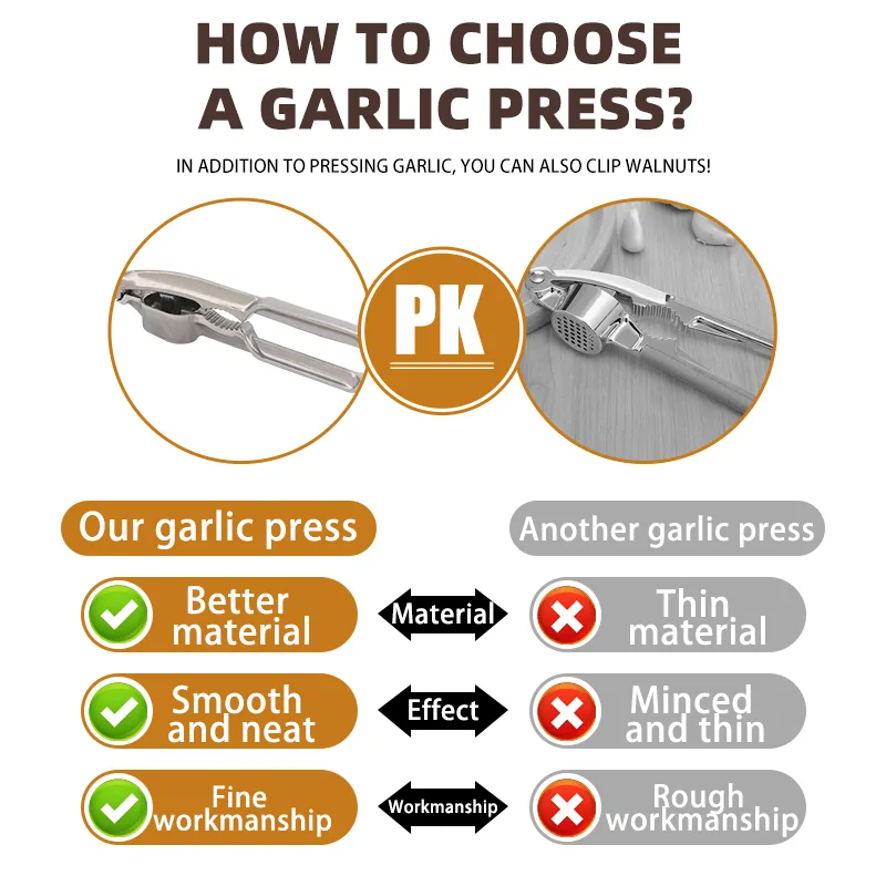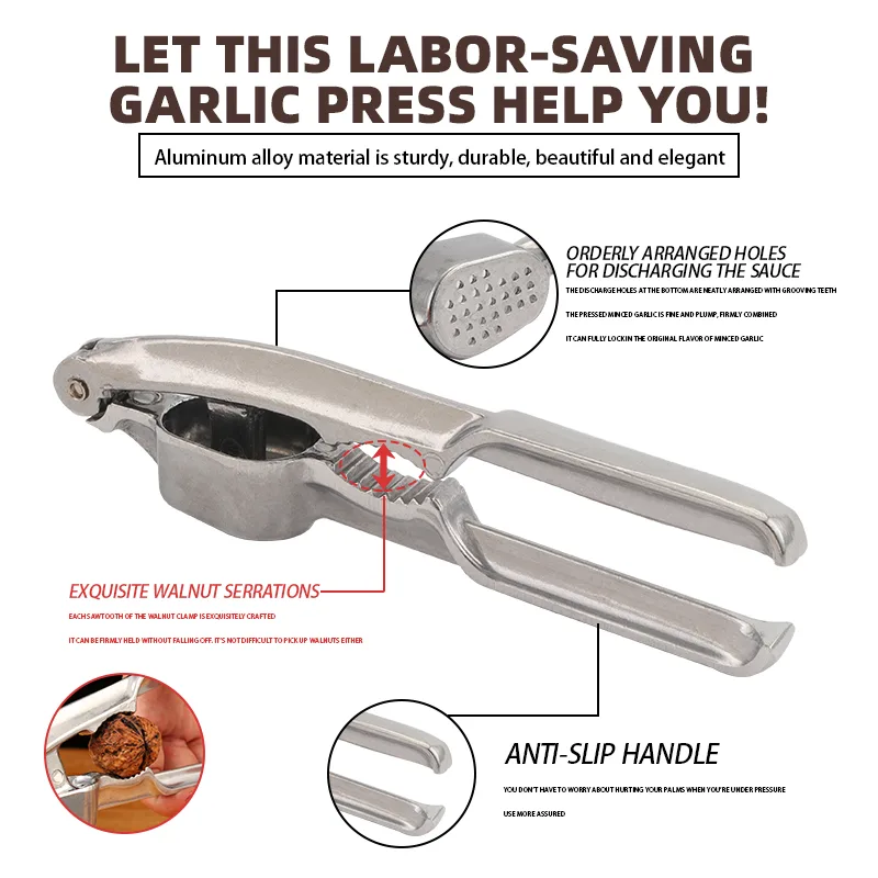 2-in-1 Multifunctional Design: This multifunctional aluminum garlic press features a serrated center section that doubles as a sturdy nutcracker, allowing users to process garlic and crack walnuts or hazelnuts with a single tool.
