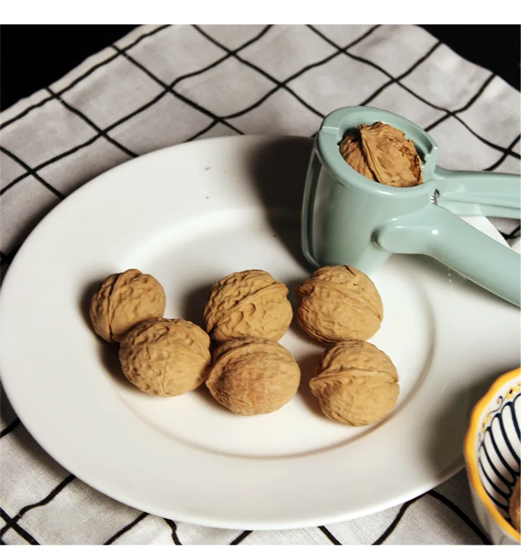 The design is smart. The Walnut Clip has an ergonomic handle. Your hand fits it comfortably. You do not need big strength. Even children or older people can use it. You press the handles. It is effortless. The tool does the hard work. Look at the second picture. There is a white plate. On it are whole walnuts and the light blue Walnut Clip. One walnut is open. It shows the result. Using this walnut cracker is simple. Anyone can do it. It is easy for beginners. It is easy for everyone.